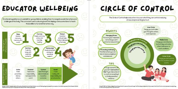 The guide also focuses on educator wellbeing and includes reflection activities for educators or parents to do alone or discuss as a team. These pages highlight strategies for managing stress, maintaining a positive mindset, and prioritising self-care, helping create a supportive and balanced environment for both themselves and the children they teach